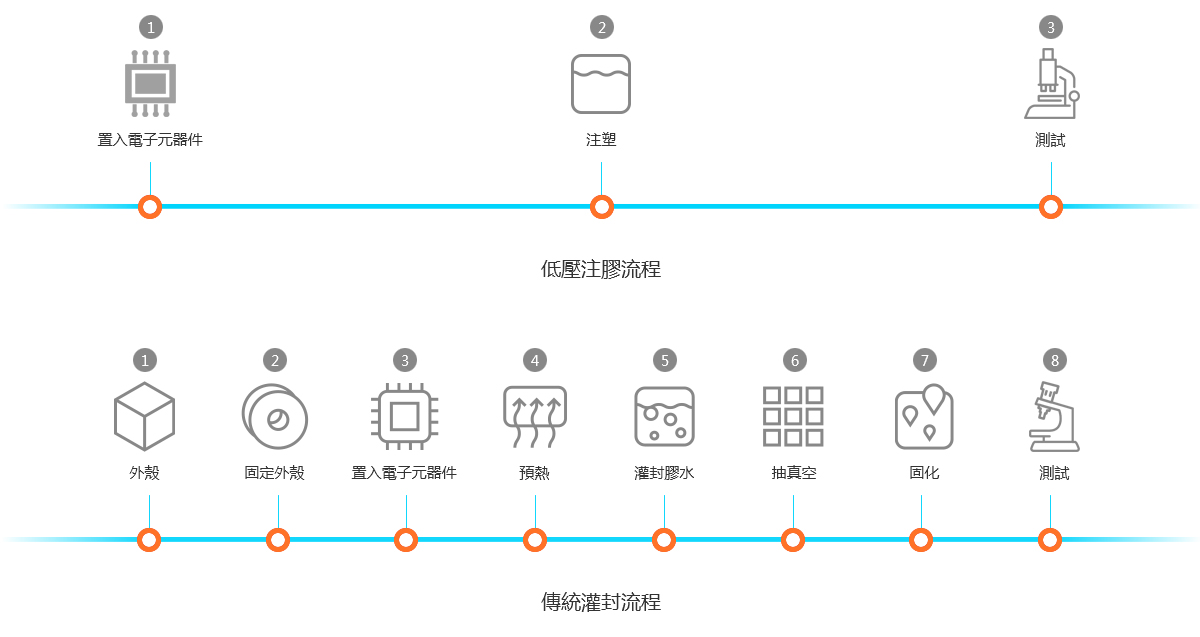 傳統(tǒng)高壓注膠工藝中,注膠壓力大,因此在注膠過程中脆弱的精密元器件易損壞,導致生產過程中的次品率居高不下。